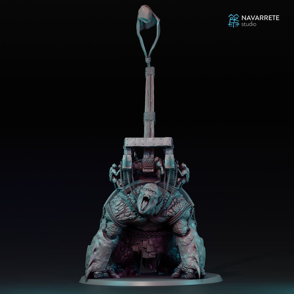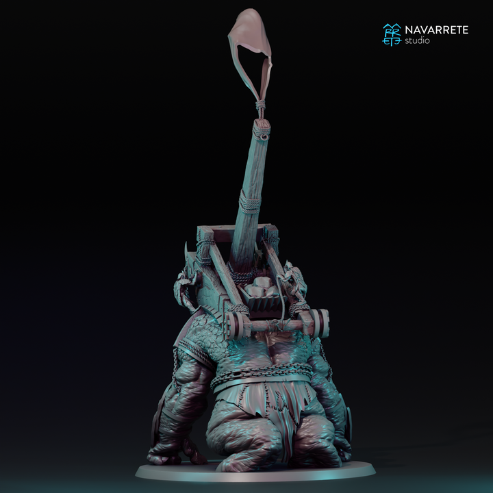 This set includes: -Catapult War-Beast, -Two interchangeable head options (one with a helmet and one without) -4 Goblins. Base: 160x160 mm (Printed in FDM to reduce cost, can print in resin on request at greater cost)