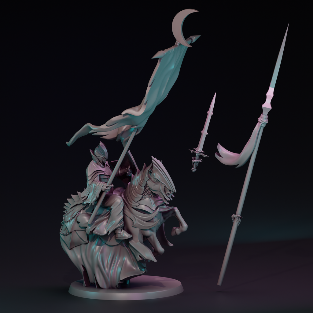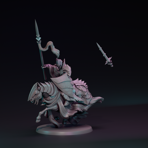 This set contains: 3 different Shadow born Knight cavalry models. 1 Shadow born Knight cavalry model with banner. Each model comes with the option to switch between a sword or a spear and all models come with a 40mm base.