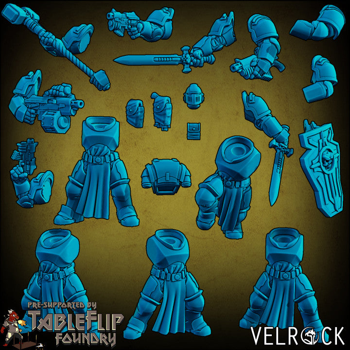 The set includes 5 marines separated into unique bodies, arms, and heads, as well as accessories. all set at 32mm scale (although they are significantly larger than a 32mm character) to fit on a 32mm base.