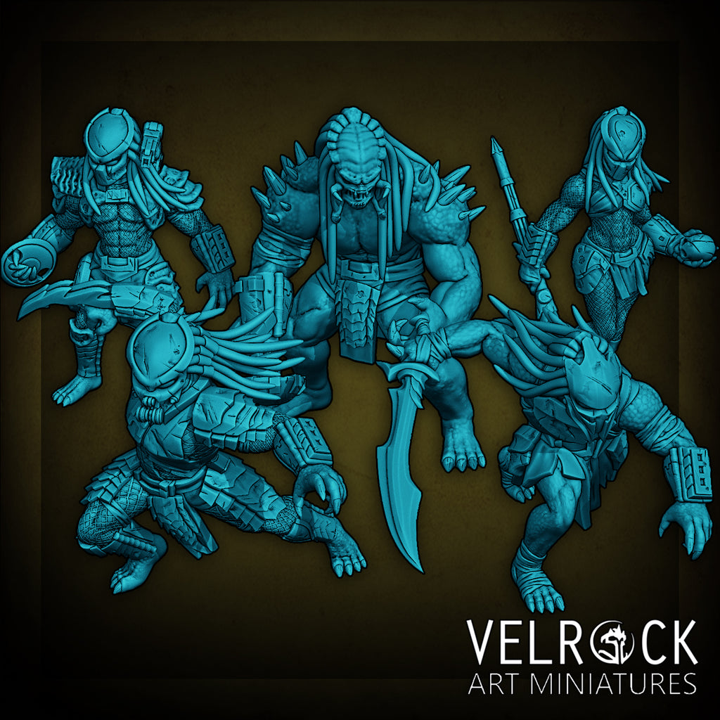 The set includes 5 unique hunters. all set at 32mm scale to fit on a 25mm base.